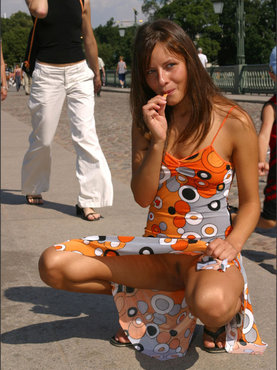 Молодая красотка с интим стрижкой задирает сарафан на улице